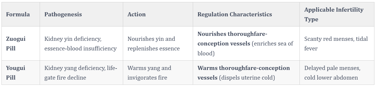 Yougui Pill treats infertility through the mechanism of "warming kidney yang → warming thoroughfare-conception vessels → regulating the uterus." It is particularly effective for infertility caused by kidney yang deficiency and thoroughfare-conception vessel cold. Its core action lies in restoring life-gate fire, warming qi-blood in thoroughfare-conception vessels, and enabling conception. Clinically, precise pattern differentiation is essential to distinguish it from Zuogui Pill (which nourishes yin). When necessary, combined use for dual yin-yang supplementation (e.g., integrating Zuogui and Yougui Pills) may be employed.